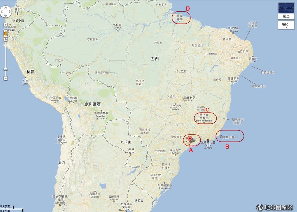 巴西國土在南美洲幅員寬廣,照片中的A、B、C、D四點就是這次傳出大規模示威抗議的地點。