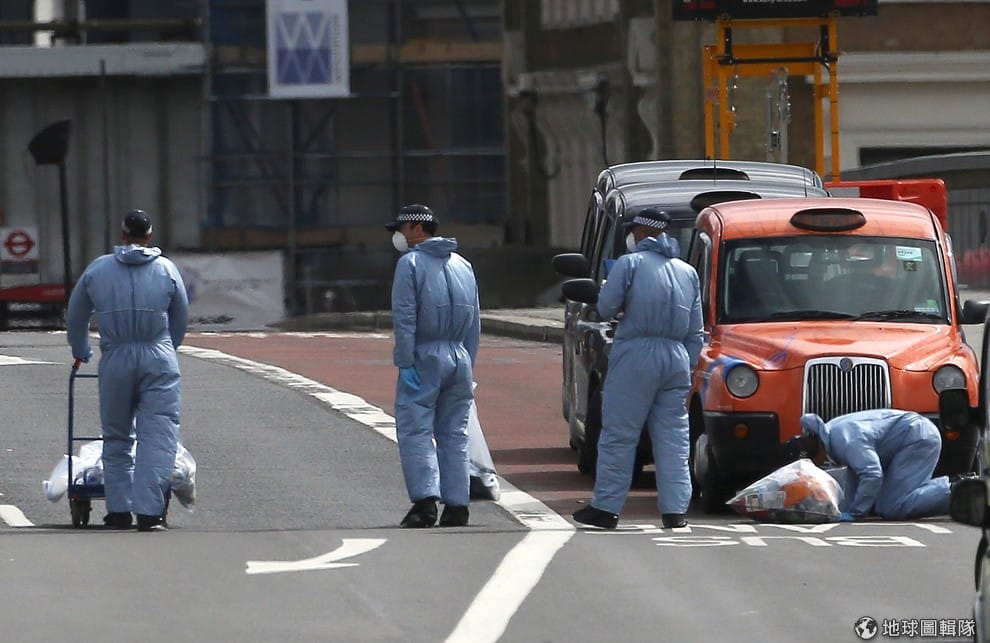 周日,在被警方封鎖的倫敦橋上,鑑識人員正在進行地毯性的搜索,不放過任何恐攻的線索。