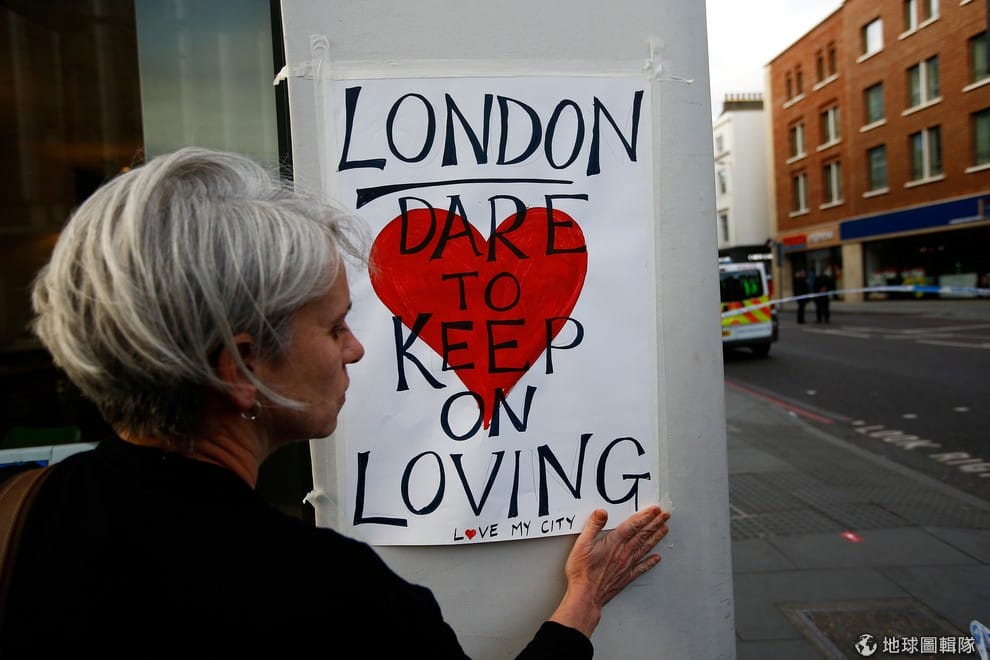 在周六晚間的倫敦恐攻發生後,一名女子在靠近事發地點倫敦橋的牆面上貼上寫有「倫敦勇敢繼續愛」字樣的海報。
