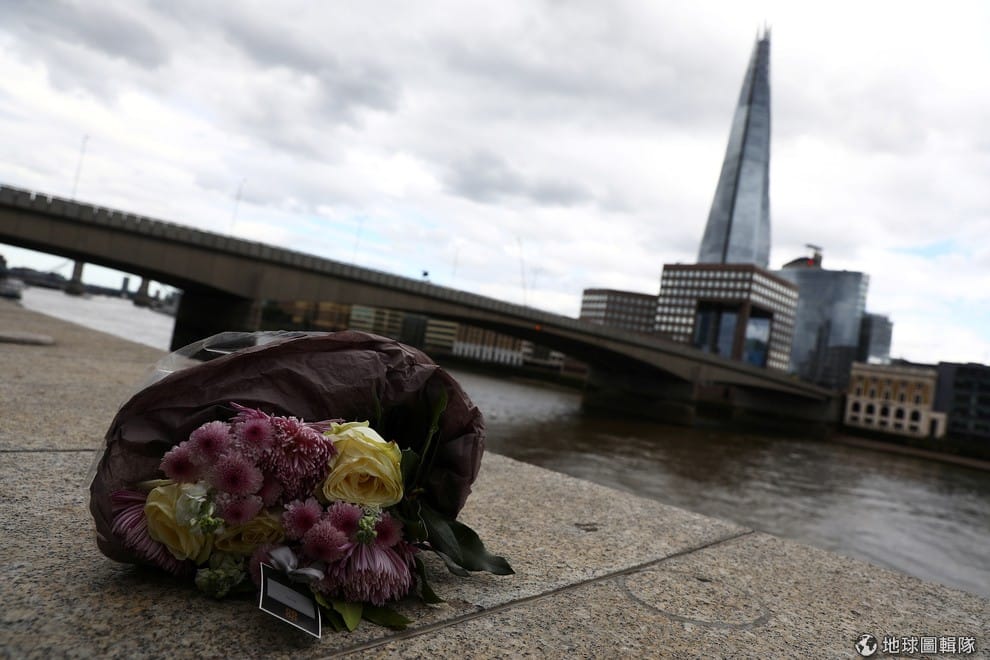 一束哀悼罹難者的花束被擺在倫敦橋附近,遠方矗立著倫敦地標碎片大廈。