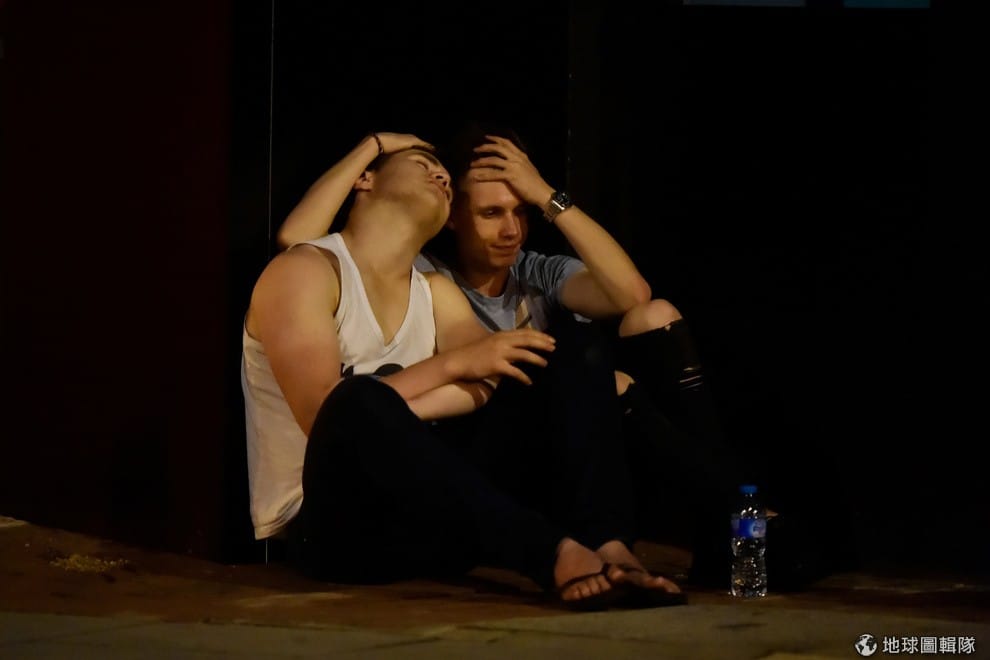 驚魂未甫的民眾在離開恐攻地點後,坐在路邊平復情緒。