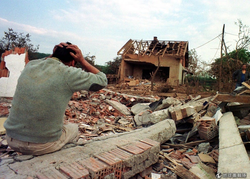 路透社圖為 1999年,NATO空襲塞爾維亞後,一名男子抱頭看著一片狼藉的家園,這場行動造成超過 2,000名平民喪生,超過 20萬人流離失所。