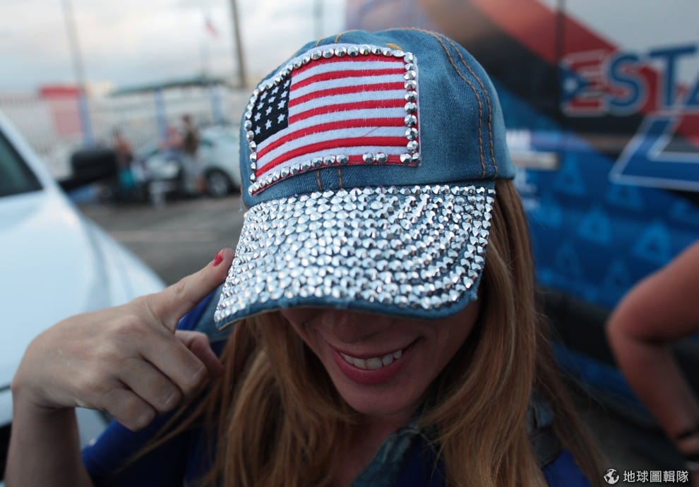 在波多黎各首都聖胡安,開心迎接公投結果的民眾指著縫有美國國旗的棒球帽。