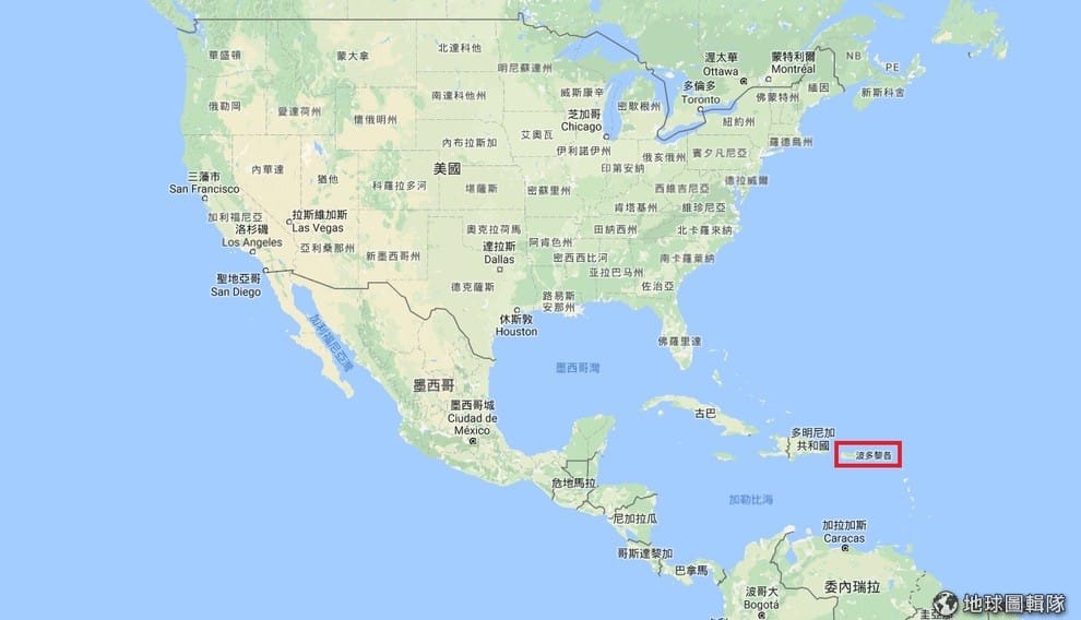 圖中紅框處為波多黎各的位置。目前,位於加勒比海地區的波多黎各屬於美國的自由邦(境外領土),風景秀麗、國內經濟仰賴觀光深,然而因為長年舉債的關係已於今年五月宣告破產。居住在當地的民眾雖然是美國公民,但對美國總統大選沒有投票權,也不在聯邦預算的相關補助範圍內。