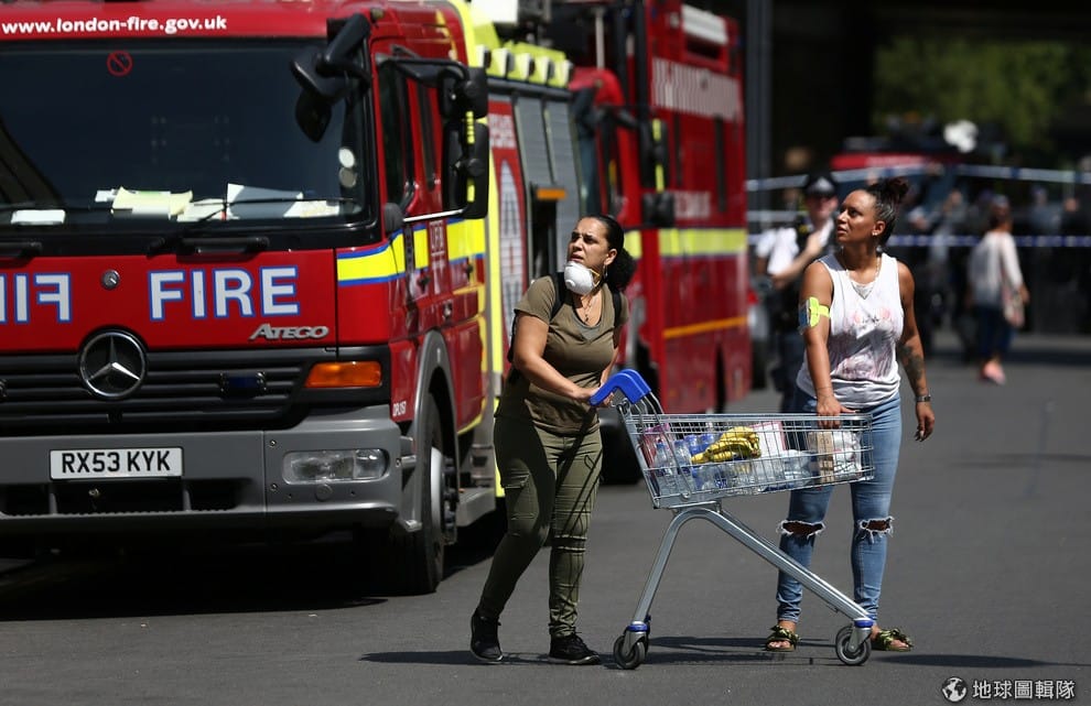 路透社運送物資的民眾戴著口罩,抬頭看著冒出濃煙的格蘭菲塔,這次的大火總共出動了至少 250名消防員與 40輛消防車,還有另外 20名救護人員在現場待命,其中包含危險區域應急小組。