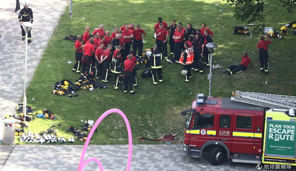 消防人員站在雲梯車上不斷往冒著濃濃黑煙的格蘭菲塔潑水,目前已有 12人在這場惡火中喪命,當局認為死亡人數可能再攀升。