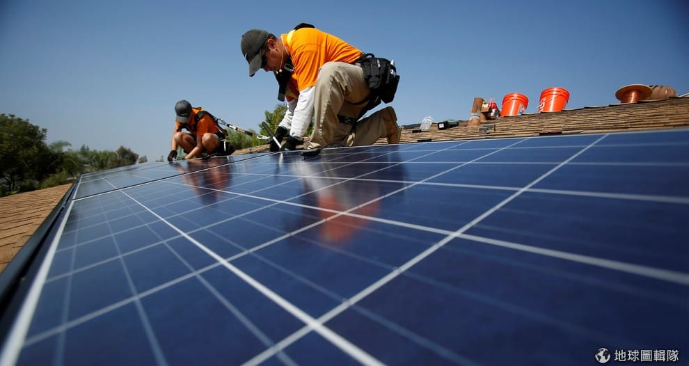 在加州的米申維耶霍市(Mission Viejo),身穿橘色工作服的技術人員正在為民宅安裝太陽能板。