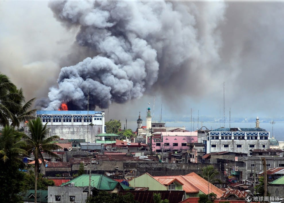 本月 14號,馬拉韋市街頭遭到空襲的大樓冒出濃濃黑煙,近一個月來,菲律賓政府軍都在此和武裝組織進行城市奪回戰。
