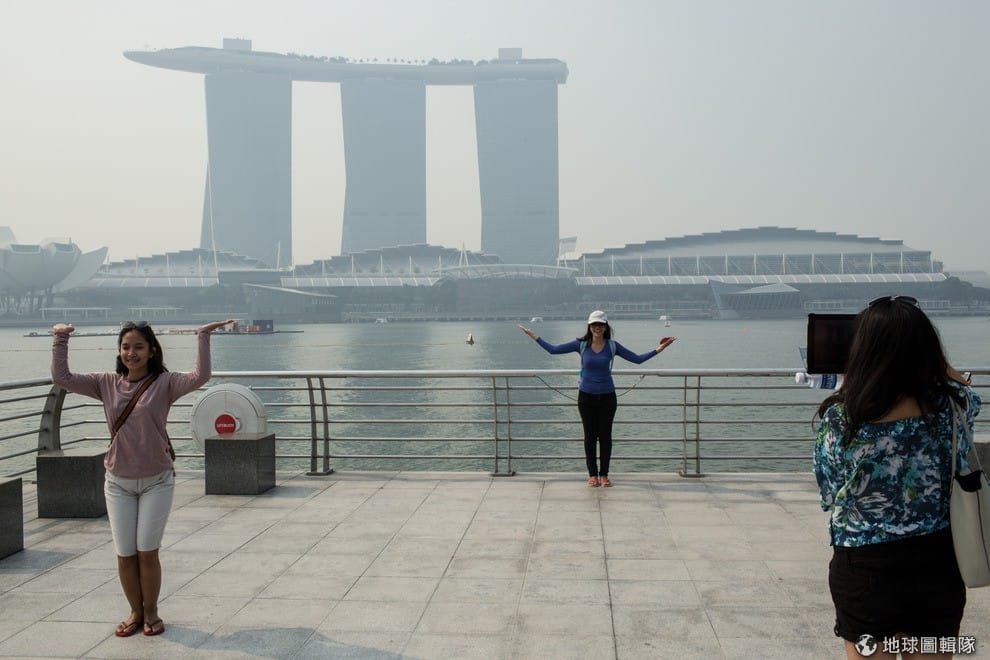 許多觀光客都會想合影的濱海灣金沙酒店(Marina Bay Sands hotel),因為霧霾的影響成了灰白一片。