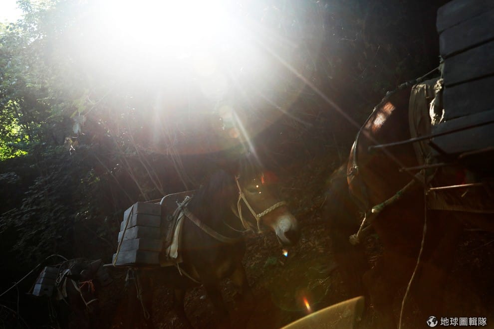 在清晨,驢子們走過陡峭的山坡,陸續將建材扛到目的地。