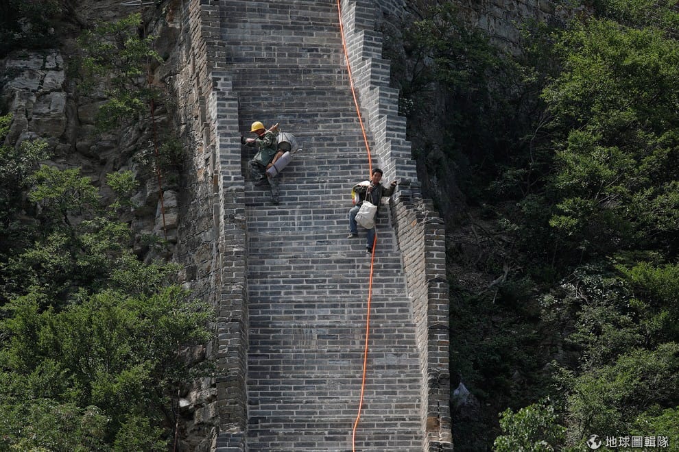 路透社工人們正忙著搬運施工工具。箭口長城地勢陡峭,這個情況也反映在許多近乎垂直的路段。