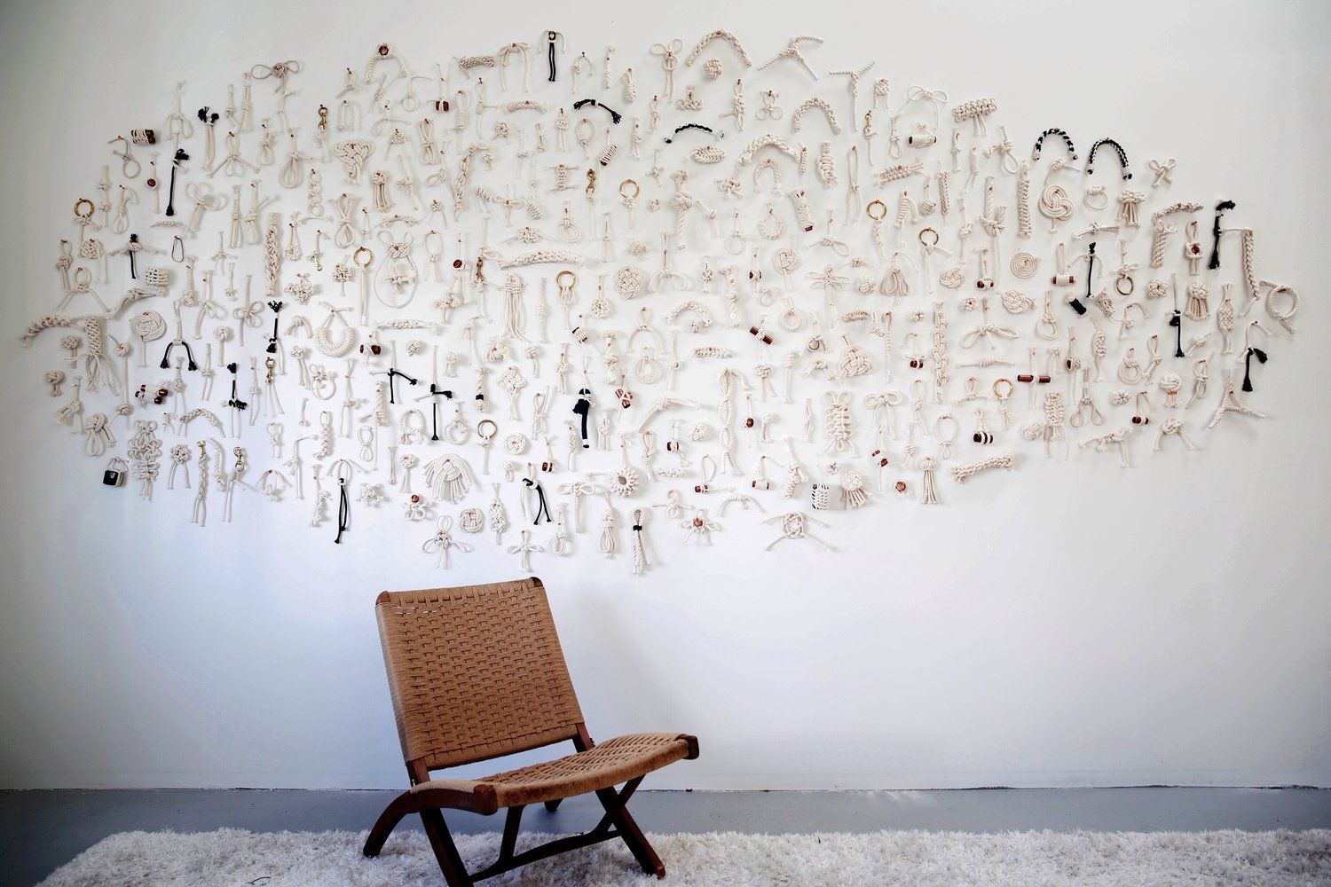 簡溫蒂小心翼翼地把去年所打的 366個繩結固定在白色牆面上,每一個繩結都別出心裁。