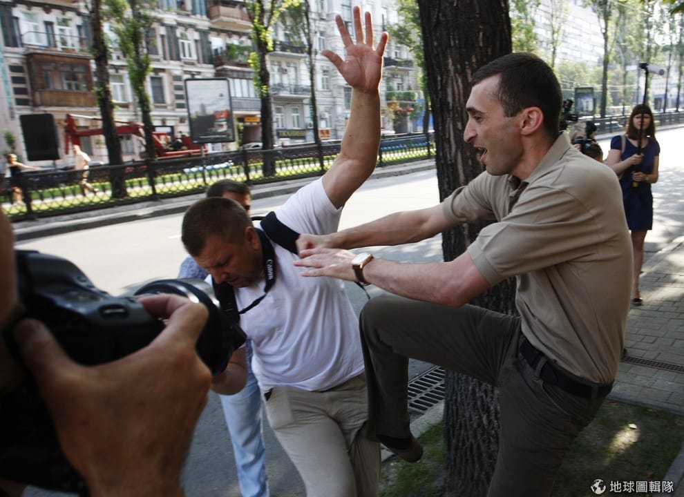 不明男士攻擊了正在工作的攝影記者。圖為2011年 7月的烏克蘭,3名攝影記者被控是俄國派來的間諜並被送交審判,當時有人聚集示威,希望政府在審判時能公正透明。