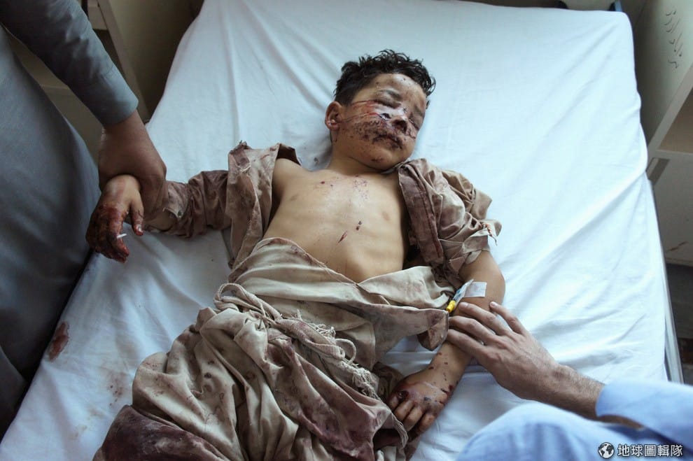 繼續閱讀一名受到爆炸波及的孩童被攝影師拍了下來,他的臉、手上都是燒傷痕跡。