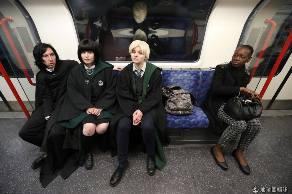 馬辛漢(左一)和他的朋友們剛進行完哈利波特電影場景的朝聖之旅,身穿史萊哲林學院校服的他們也引來隔壁乘客的注目。