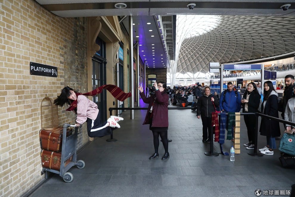 在倫敦國王十字車站(Kings Cross)前,觀光客正在模仿小說角色推著行李衝入「九又四分之三月台」的模樣,這裡是「哈迷」必來朝聖的景點之一。