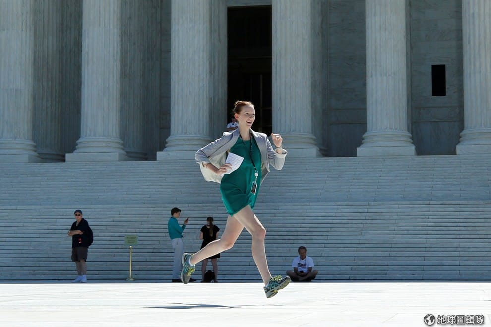 最高法院的助理在法院外奔走,忙著傳遞最高法院針對旅行禁令做出的決定。