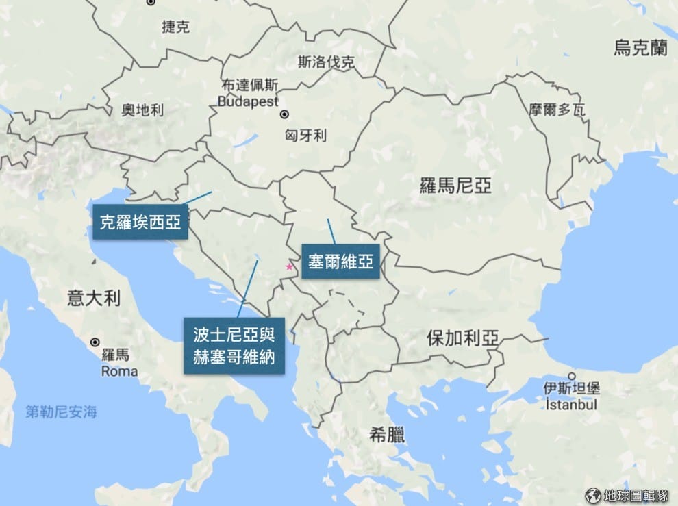 圖為波士尼亞與赫塞哥維納與鄰國位置,粉紅色星號處則是發生斯雷布雷尼察大屠殺的地方。