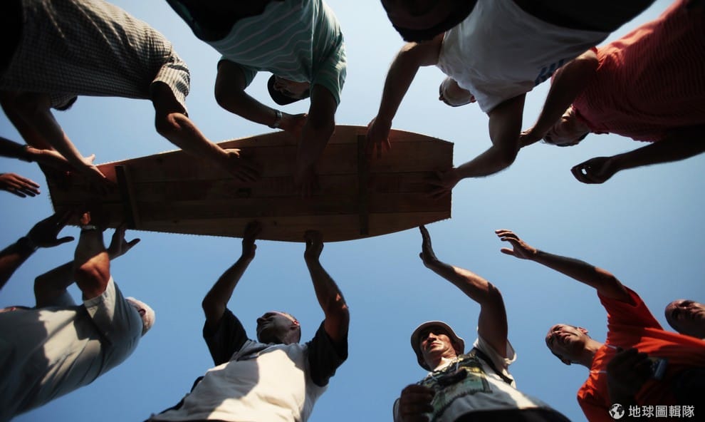2016年 6月的大屠殺大型葬禮上,人們一同把棺木抬到目的地。直到現在,確切的死亡人數依舊不明。