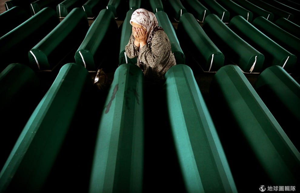 一名婦女在他兒子的棺木前哭泣。照片拍攝於 2005年,當時有 610具斯雷布雷尼察大屠殺的遺體被發現並準備被下葬,這些棺木下葬的地方已經埋有另外 1,300具受害者遺體。