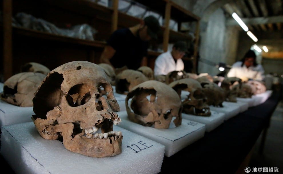 考古學家正在一一檢查、紀錄他們發現的頭骨,他們大概發現了 600多顆完整的頭骨,以及數千個骨頭碎片。