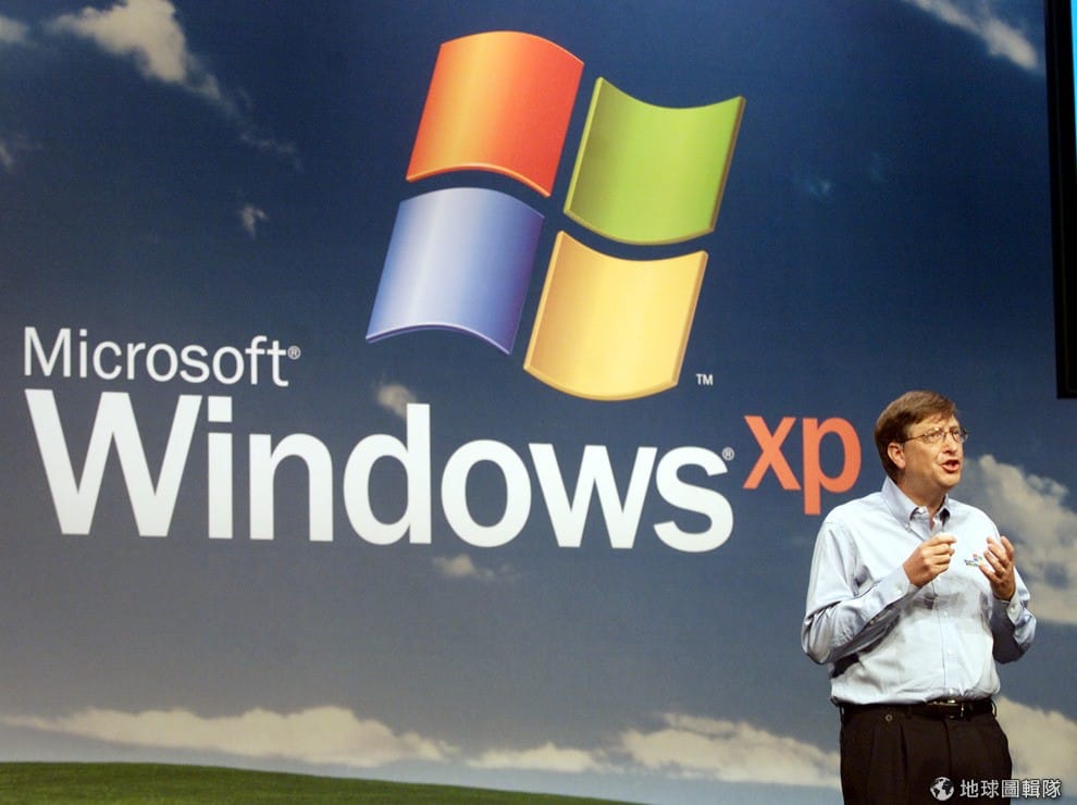 圖為 2001年微軟創辦人比爾蓋茲在記者會上介紹Windows XP作業系統,目前微軟已於 2014年停止支援該作業系統。