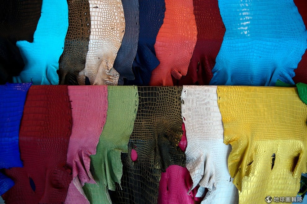 路透社在一家鱷魚皮製場裡,一片片鱷魚皮已經被曬乾,準備要進行上色作業。