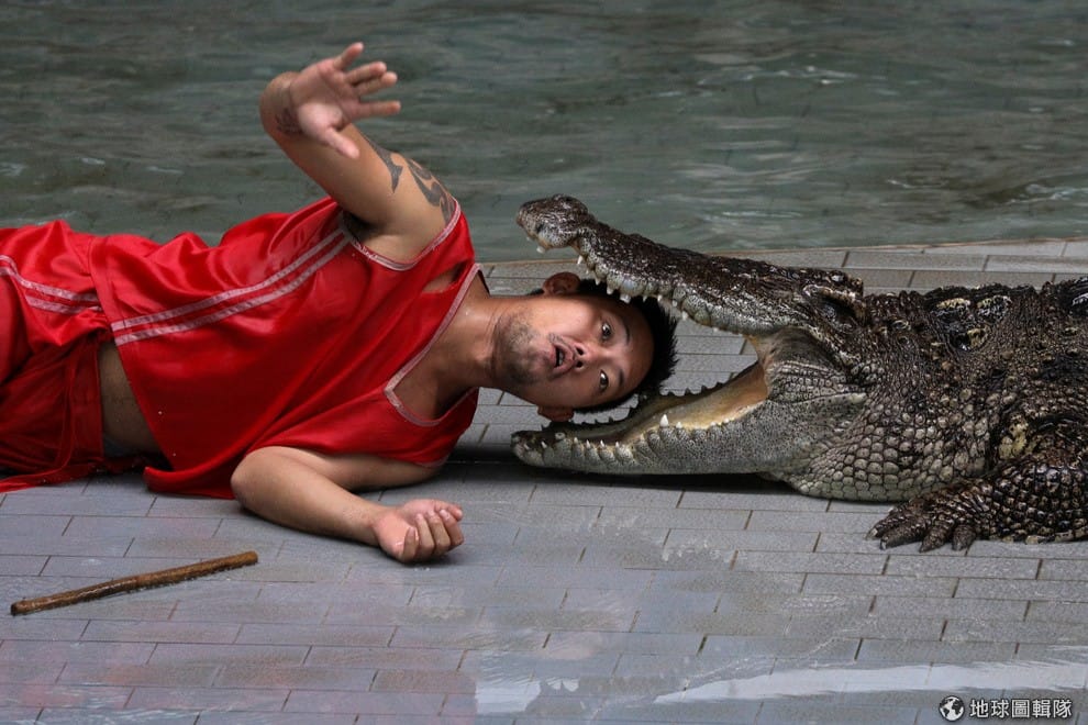 在泰國東部城市春武里府的是拉差老虎園,一名特技表演者把自己的頭擺在鱷魚的雙頰間,讓人看得捏把冷汗。