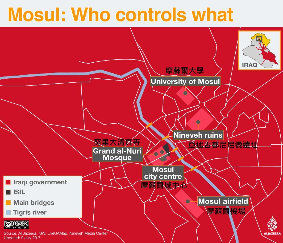 圖為摩蘇爾城的勢力劃分圖,目前紅色區域為伊拉克政府所把持,伊斯蘭國的代表顏色則是黑色,從圖中可以看到黑色的區域只剩靠近摩蘇爾城市中心的一點點。圖中藍色的部分代表底格里斯河,這條河將摩蘇爾城切成兩半,右邊為今年一月被政府軍收復的東摩蘇爾城,左方則是勝利指日可待的西摩蘇爾城。圖中也標出了今年六月被伊斯蘭國炸毀的努里大清真寺。