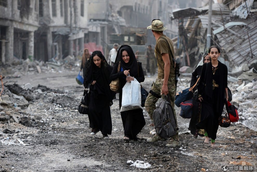 帶著家當逃離戰區的民眾,跟著伊拉克政府軍的指示前往安全的地方避難。