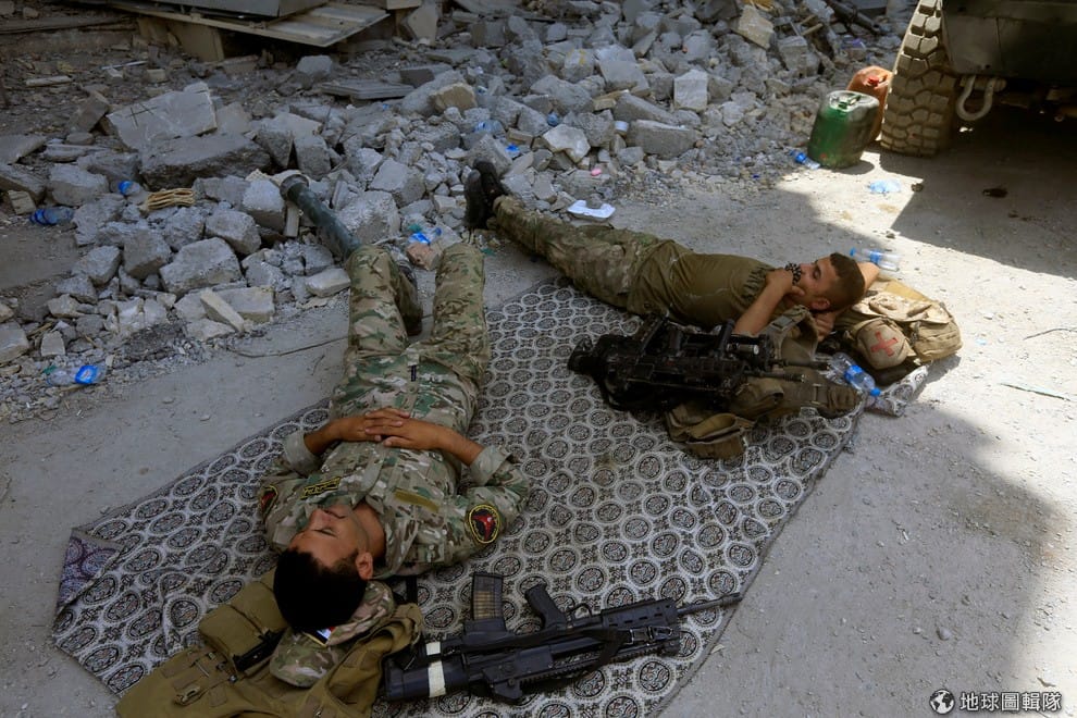 兩名伊拉克軍人躺在地上稍作休息,待會準備重返位於西摩蘇爾城老城區的戰場。