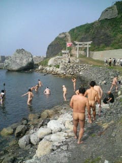 圖為男性要上島前得全身脫光的淨身儀式,且離開島嶼後這些參加祈福儀式的民眾不得透露島上發生了什麼事。