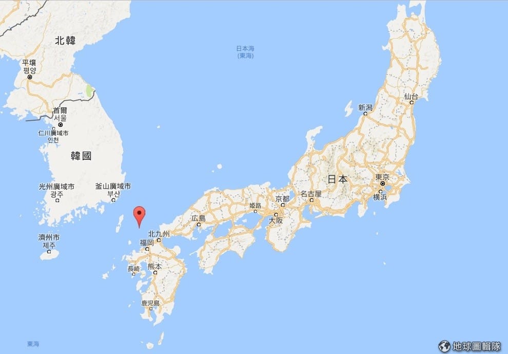圖中紅色地標處為隸屬於福岡縣的沖之島,它獨特的地理位置讓它在過去成為朝鮮和中國民眾的海上貿易交易點。