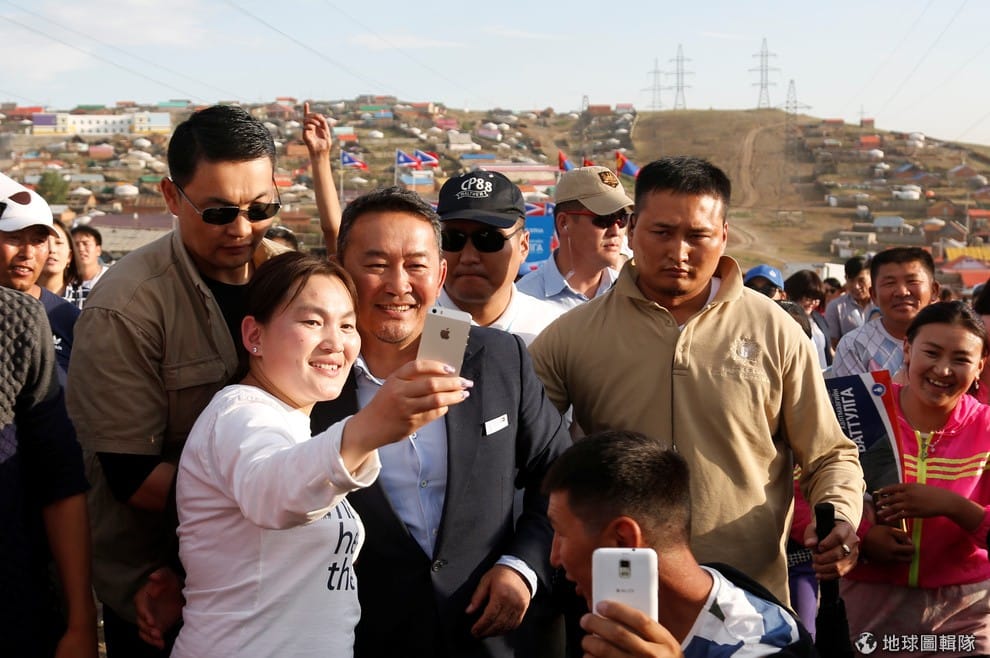 在競選總統期間,巴圖勒嘎(圖中穿西裝者)親切地和支持民眾自拍。他曾是蒙古桑博國家隊的成員,退役後成為一名商業大亨。