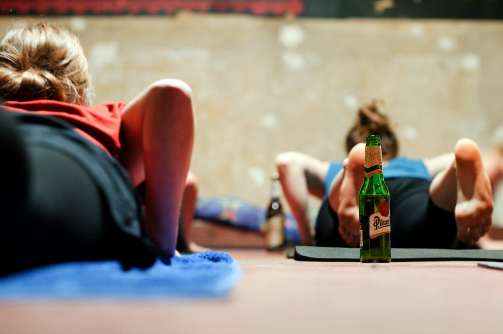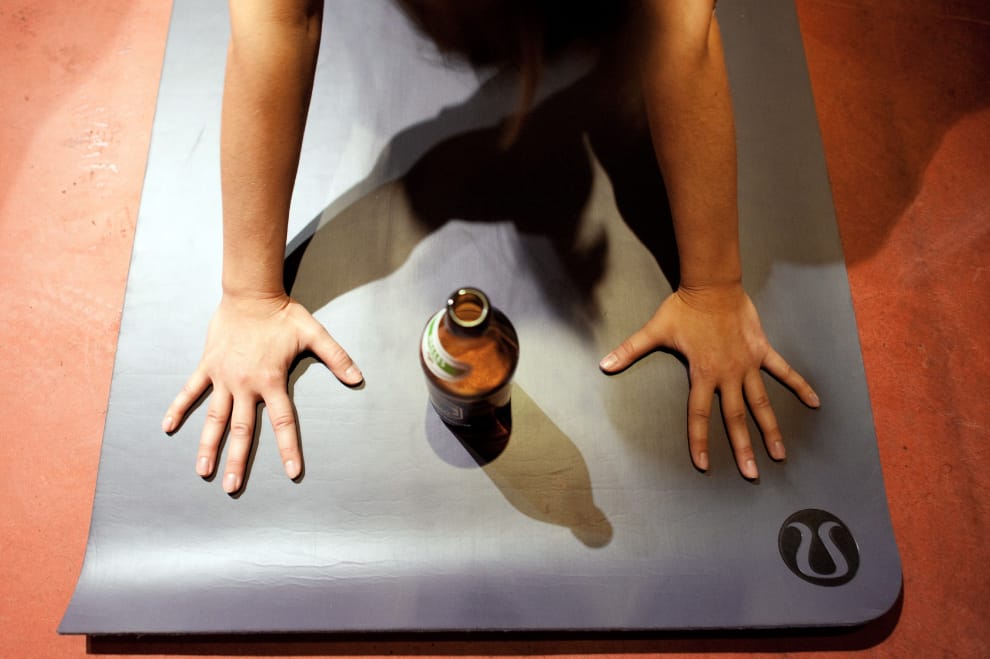 來到這間位在英國的瑜珈教室,你絕對無法忽略每位學員手上的那瓶啤酒——大家會在放下剛伸展完的四肢時小酌一口、在維持單腳站立時偷喝幾口啤酒來轉移注意力,或是設法讓啤酒瓶能在頭頂上保持平衡——不要懷疑你來錯地方,「結合和喝啤酒的喜悅和瑜珈的正念」,正是「啤酒瑜珈」的最大特色。