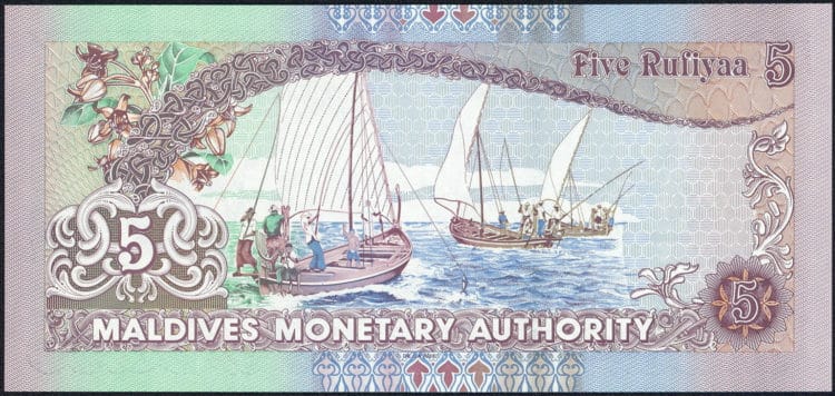 圖為目前在馬爾地夫仍流通的舊型 5拉菲亞紙幣。