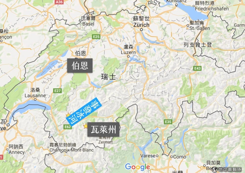 圖為事發地點的相對位置圖。警方相信他們是從伯恩走到瓦萊州的時候不慎跌入冰河中。