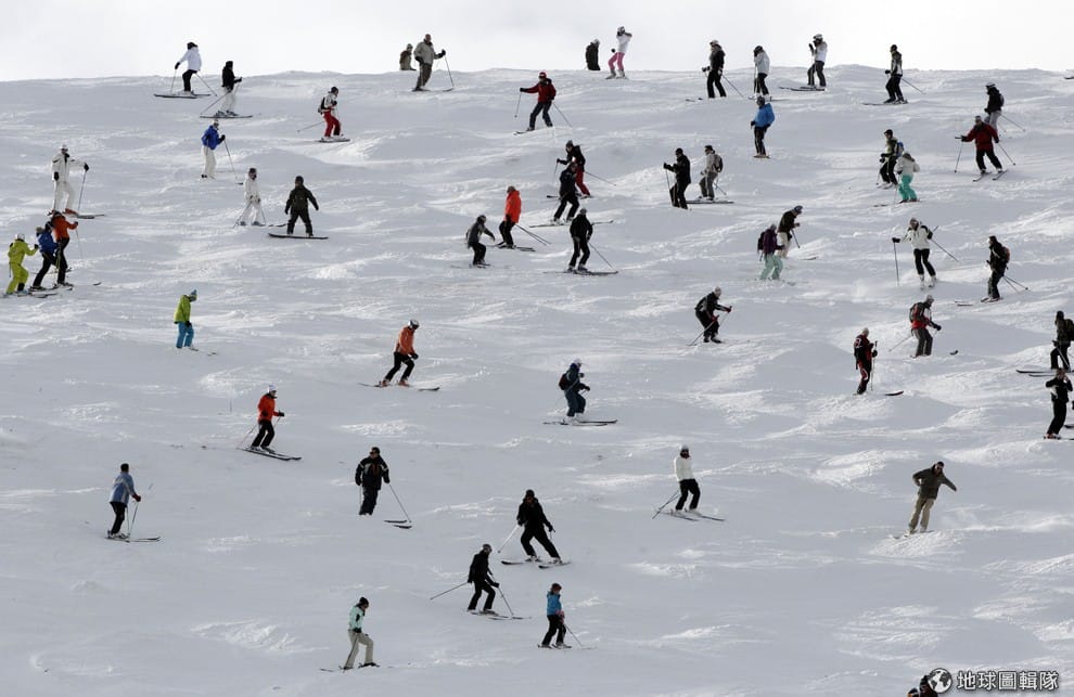 畫面中人們正在享受滑雪的樂趣。為了避免發生意外,現在大部分的滑雪場都會區隔出安全區域。
