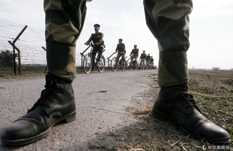 印度邊界警察騎著腳踏車,在印度東北邊平原上的古城西利古里巡邏,該地的地理位置敏感,具有重要的戰略功能。