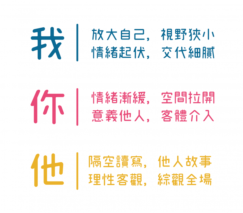 變化「我、你、他」三種寫作位格,會產生不同的心理感受。
