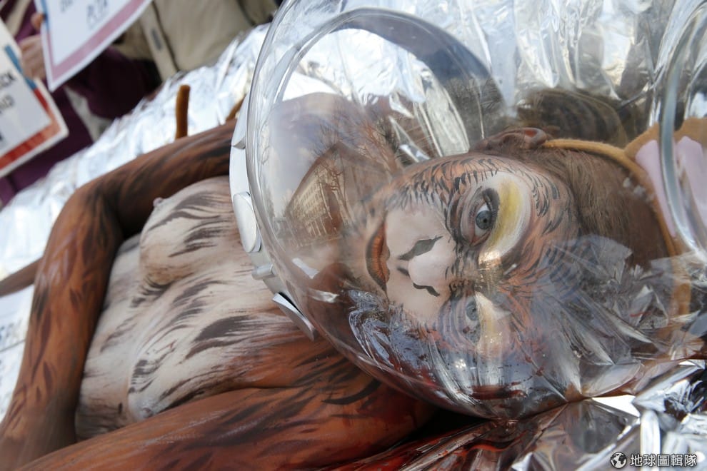 圖為 2016年3月,一名PETA的成員打扮成猴子、戴著太空帽在街頭表達不滿,藉此抗議那些被送上太空的實驗猴。