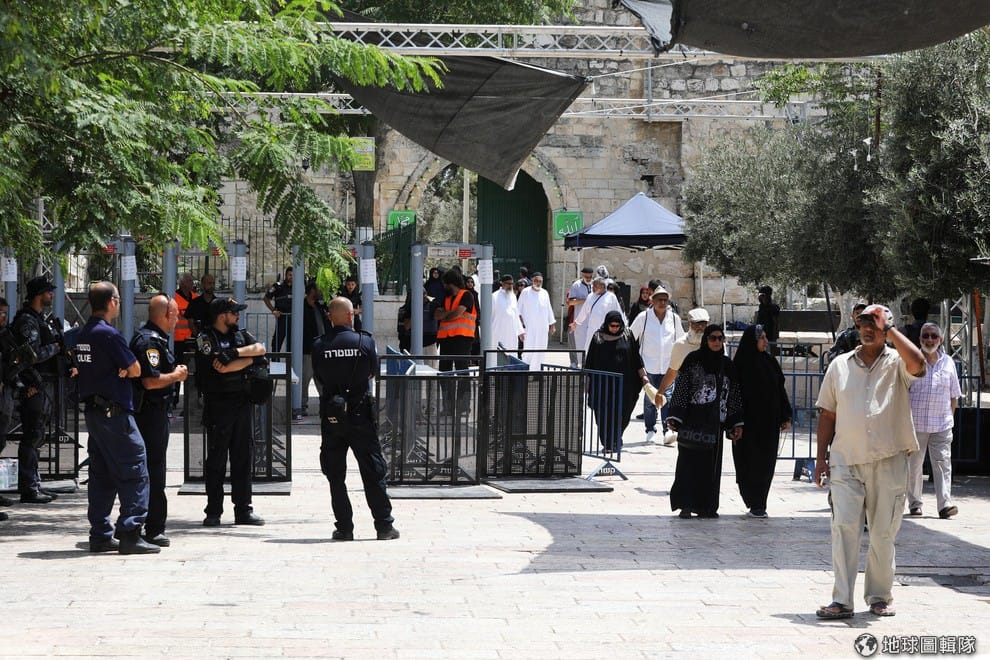 畫面中可以看到先前的金屬探測器把前往聖殿山的入口完全圍住,且受到以色列官方管制。
