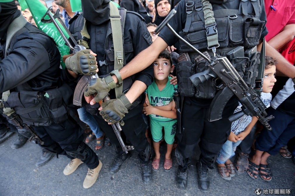 一名巴勒斯坦男孩站在巴勒斯坦組織哈瑪斯(Hamas)的軍人腿邊張望著。為了對以色列在阿克薩清真寺新建設的安全措施表達不滿,哈瑪斯在 20號於加薩走廊以軍事表演作為抗議。