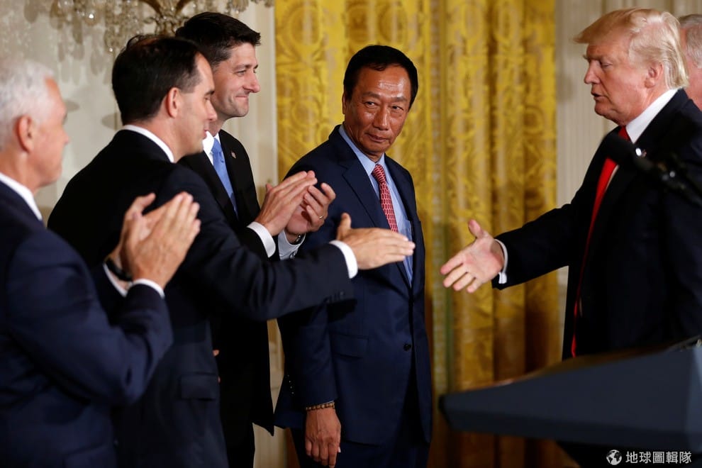26號這天,鴻海董事長郭台銘出席美國白宮記者會,宣布了富士康在威斯康辛州的設廠計畫。圖左到右分別為美國副總統彭斯、威斯康辛州州長沃克、眾議院議長萊恩、鴻海董事長郭台銘以及美國總統川普。