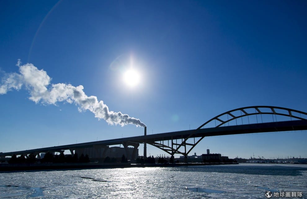 圖為一座位於威斯康辛州的工廠,煙囪冒出濃濃的白煙。富士康LCD面板廠即將落腳威斯康辛州,當地從 2000年開始製造業工作機會縮減了四分之一。