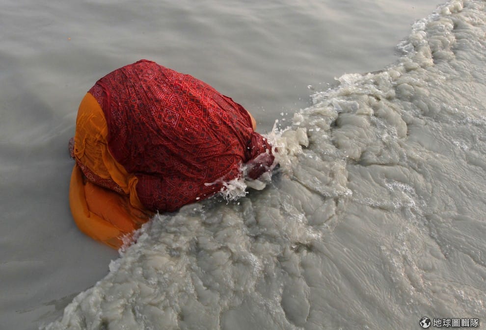 2013年 1月,一名印度教信徒跪在恆河旁祈禱著。這種不准直呼名字的規範,是因為在傳統上,丈夫會被視為神一般的存在。