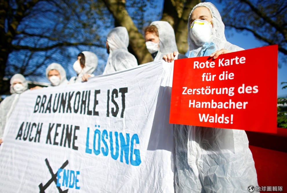 目前德國民生電價平均每度0.3歐元左右(約新台幣10.5元),與20年前比起來足足漲了兩倍,主要是反應再生能源附加稅。即使如此,德國人仍甘願這麼做。圖為今年 4月,環保團體聚集在萊茵西伐利亞電力公司(RWE)外抗議。