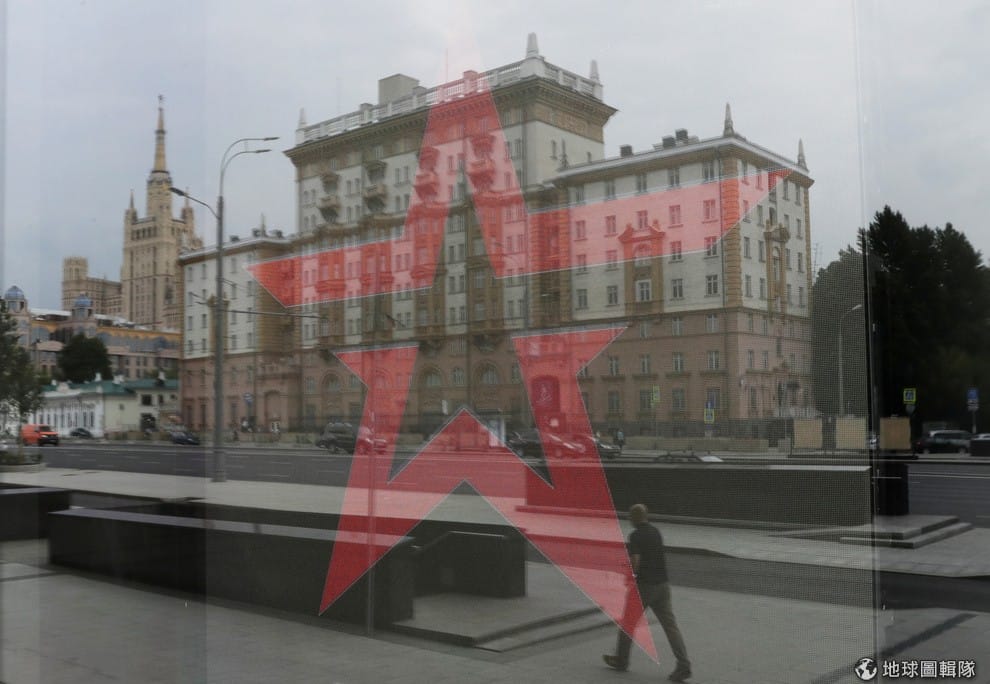 美駐俄國莫斯科大使館被倒映在一間俄國軍用品專賣店的玻璃上。俄國不只驅逐美駐俄人員,還沒收了美在俄國專攻外事人員使用的兩處財產。