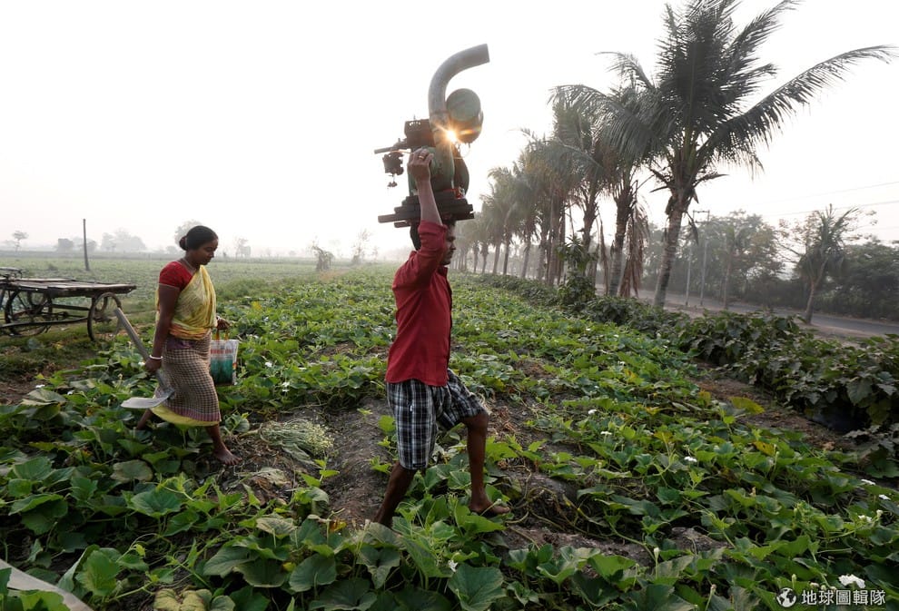 一名農夫拿著水泵浦在農田內行走。印度農夫向銀行借貸購買種子、機具,卻因為作物收成不佳而沒辦法還債。