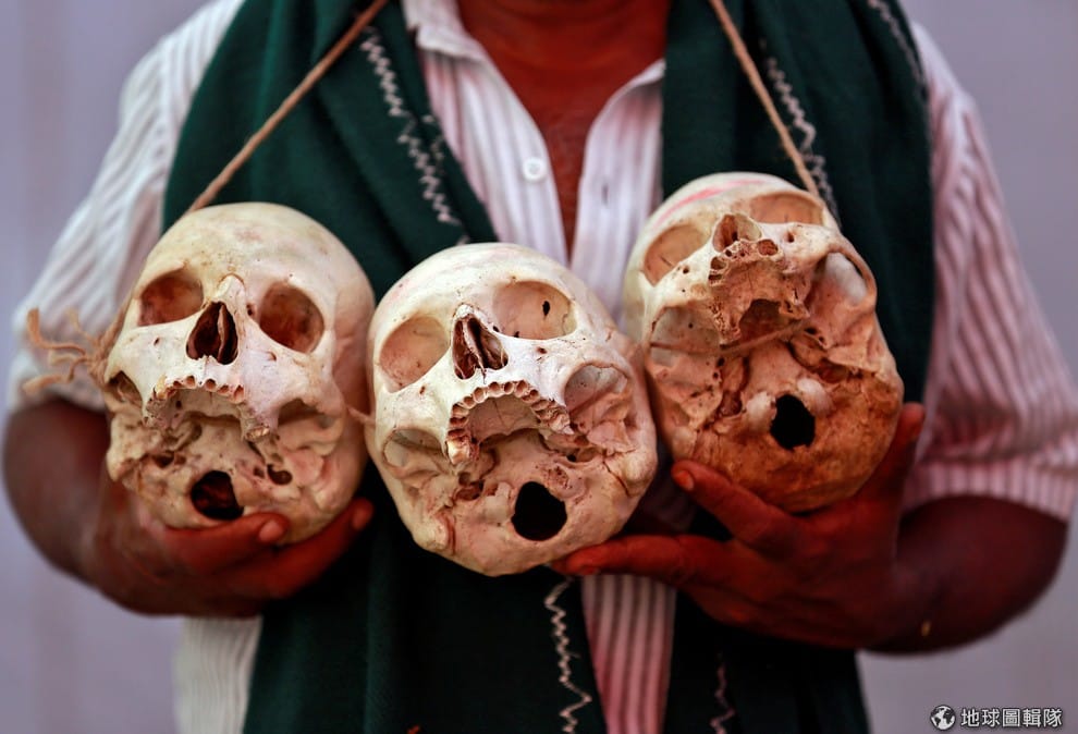 坦米爾納德邦(Tamil Nadu)的農夫手上拿著其他坦米爾族農夫的頭骨。他們指出,這些農夫是在跟聯邦政府爭取抗旱改革政策時自殺。